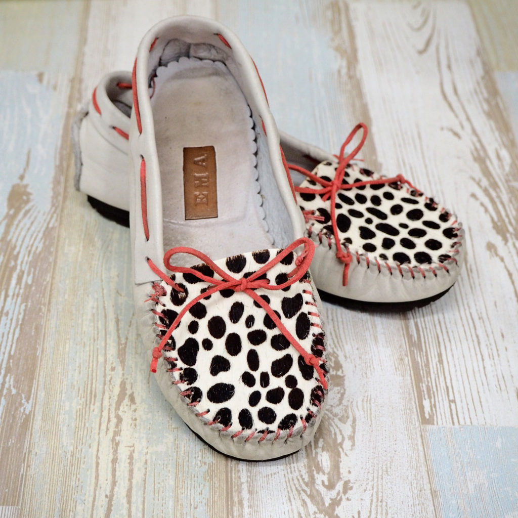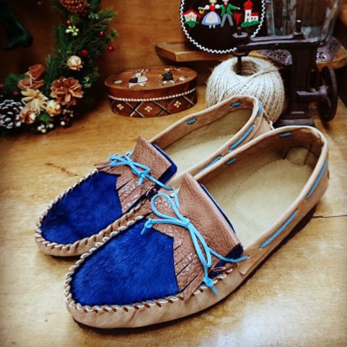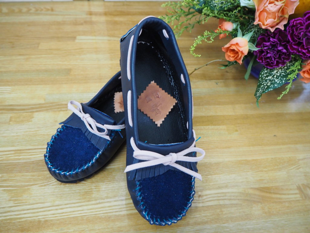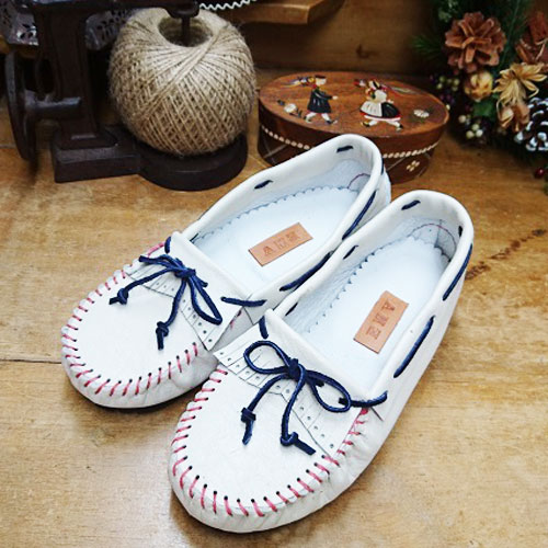モカシンの元々の原型は一枚革で底から側面や足の甲部分を覆い紐でつないで作った柔らかい靴のようなもの。現代では頑丈なソールなどをあてて実用的なファッションシューズとして定着しました。