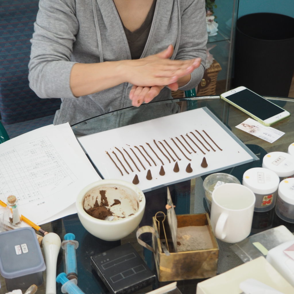 お香作りの材料となる様々な天然香料に実際に触れていただきながら、目的にあった香料を調合していただきます。調合はご自身で行っていただきますので、アイテムによってはオリジナルは配合の香りで仕上げることもできます。