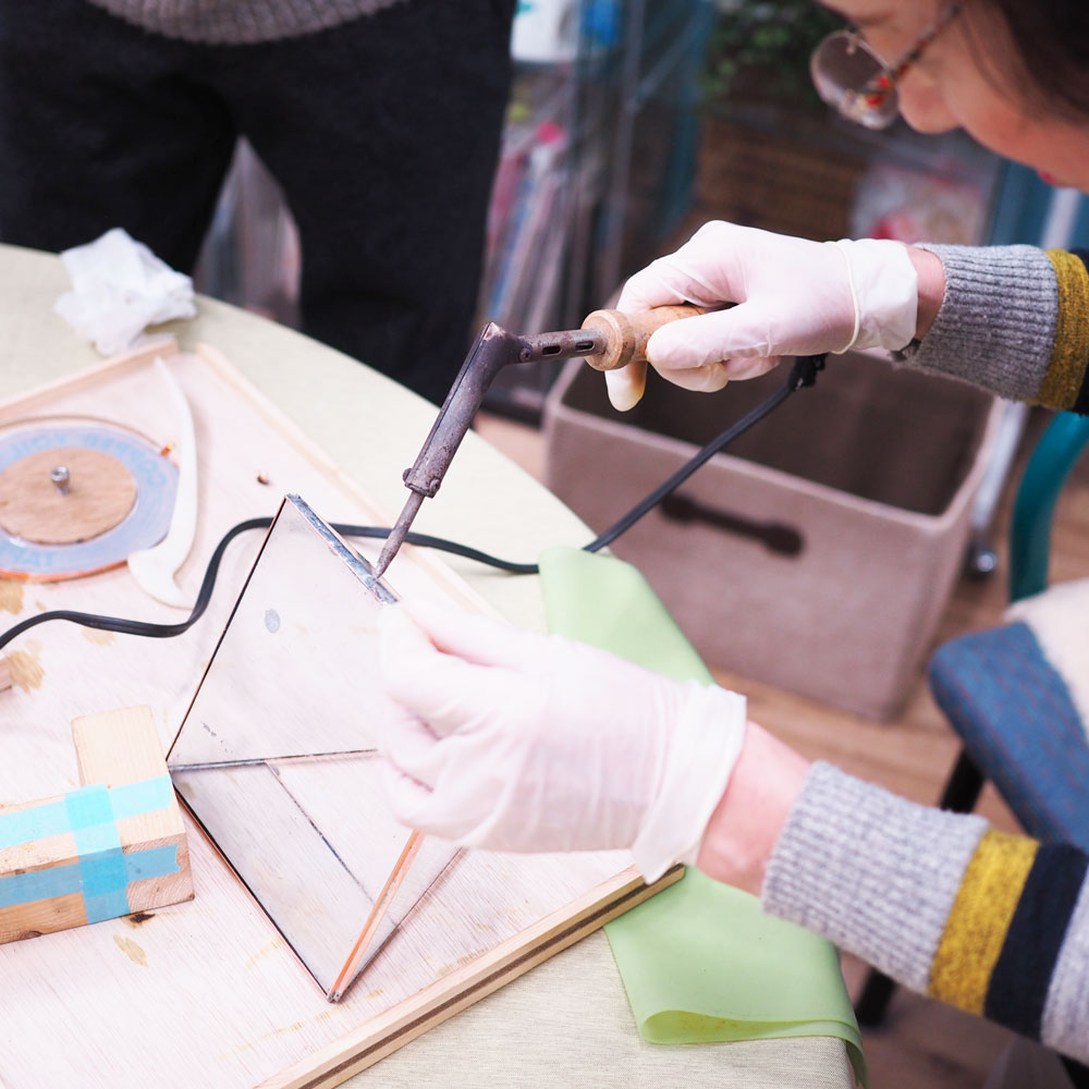 ステンドグラス制作で用いられる「ハンダ」(鉛とスズを主成分とした合金)を使った工法でガラスケース作りを体験いただける1回完結レッスン。