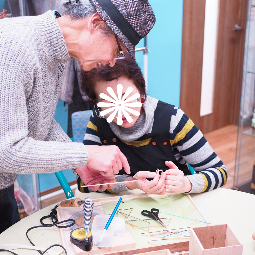 プリーズゼロワン教室での体験では主にステンドグラス工法(ハンダづけ)体験ワークショップ各種の指導を担当。トルコランプ体験ワークショップを担当する上浦先生のアシストも兼任します。