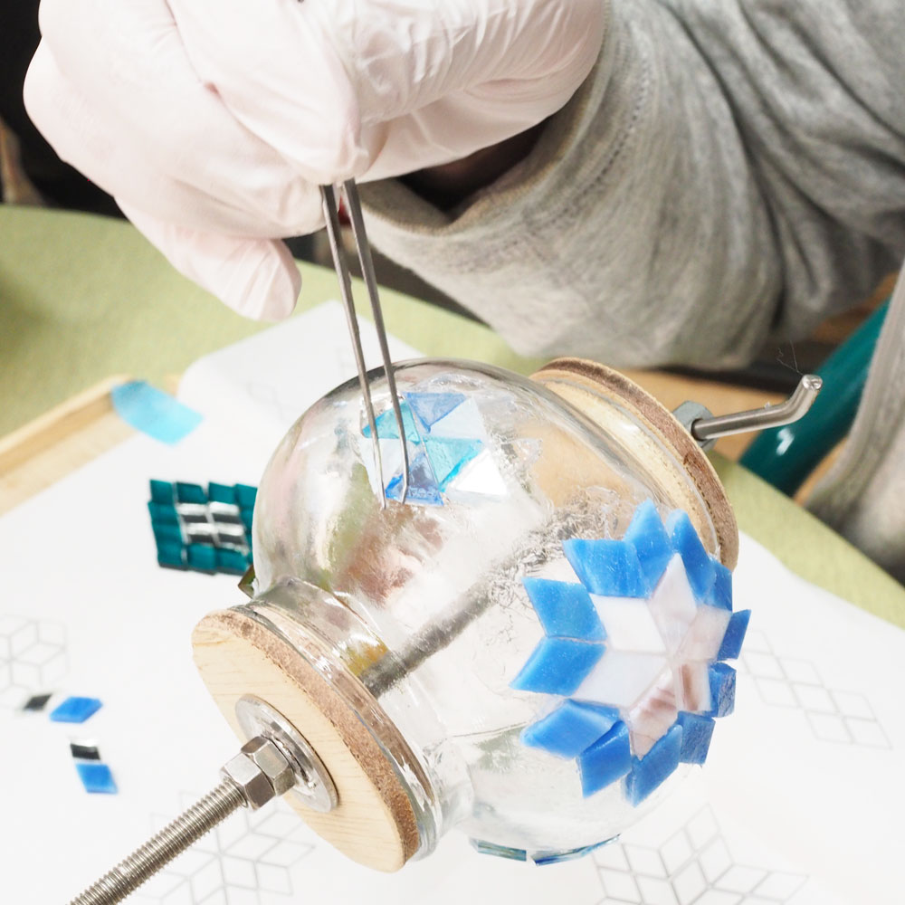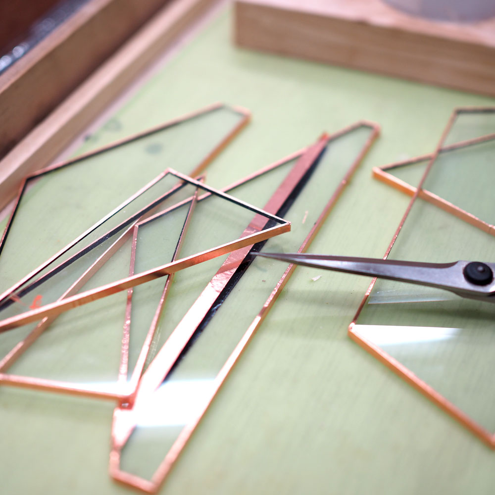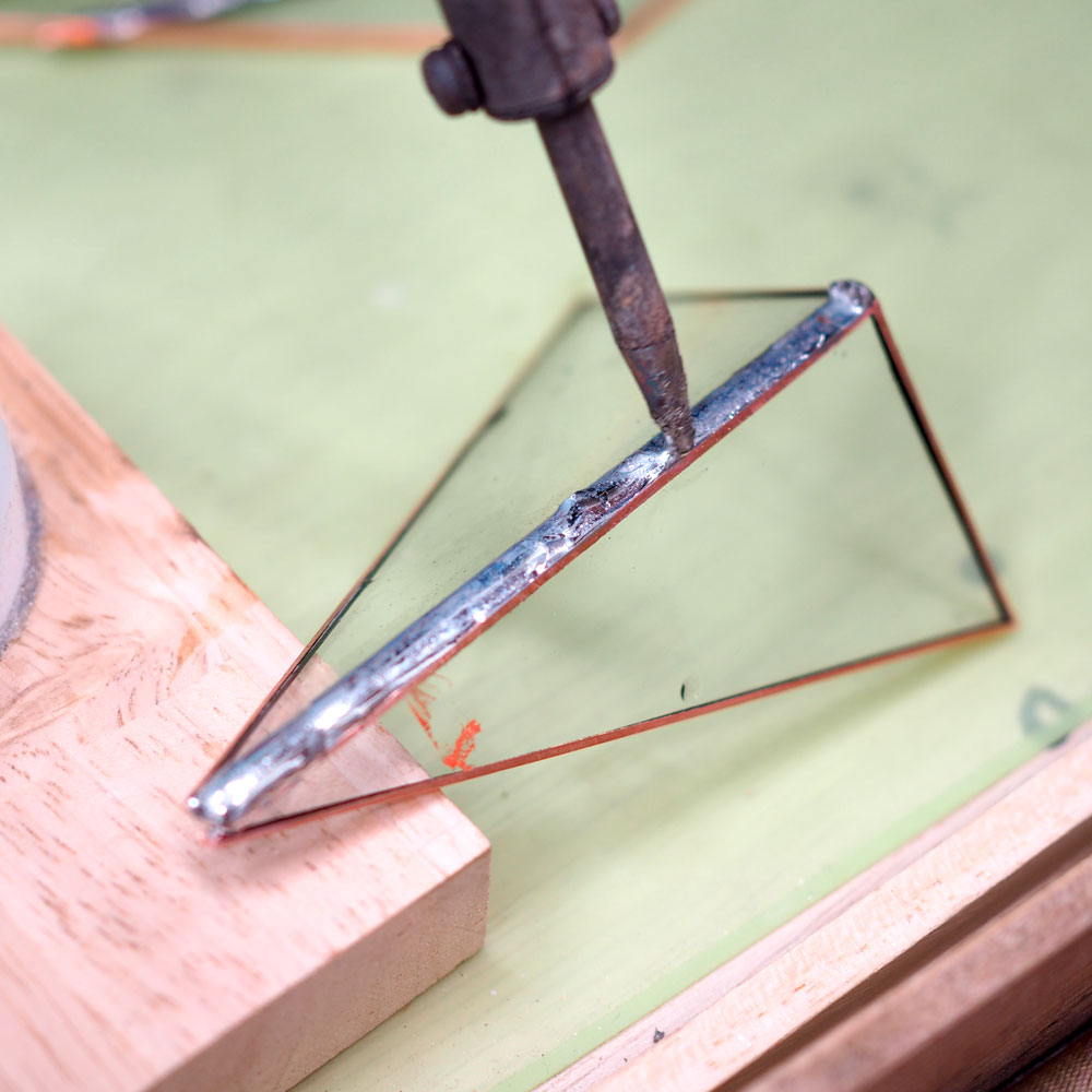 主にステンドグラス制作で用いる工法を使って、ハンダごてでガラス同士を溶接して立体的に組み上げていく工程が中心となります。